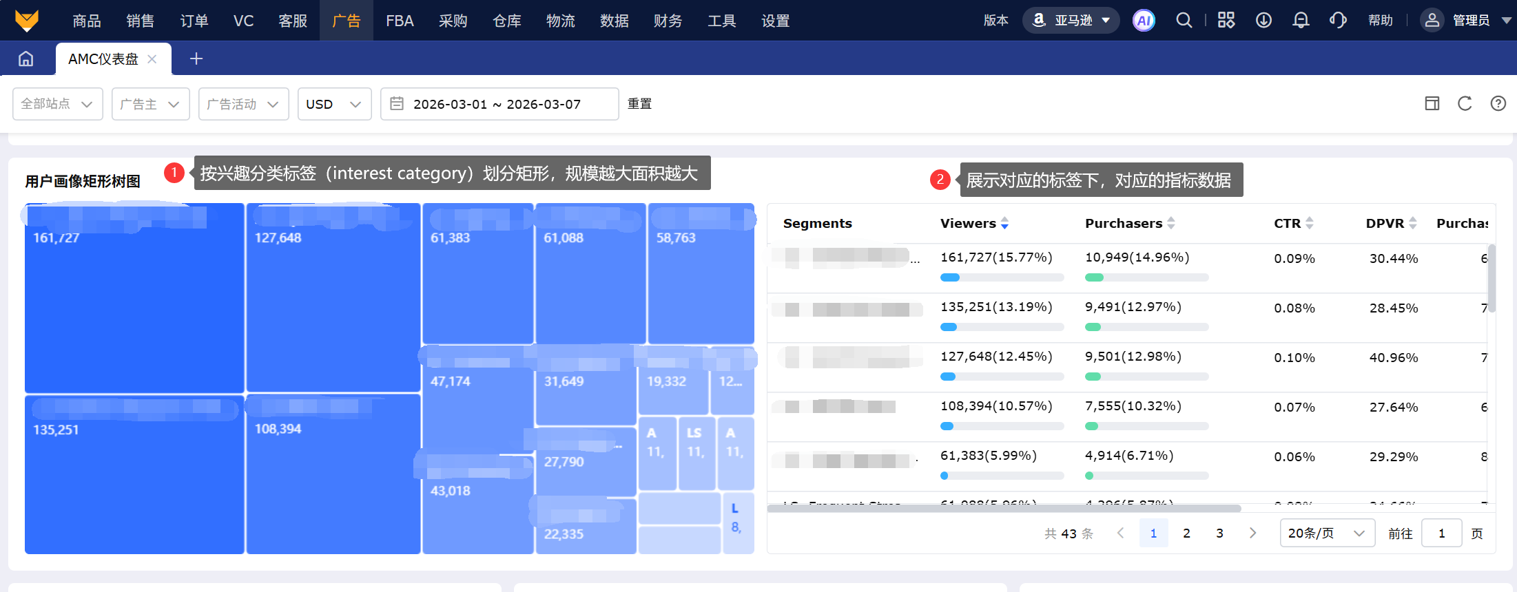 通过树图,直观展示不同兴趣偏好人群的覆盖广度,左侧列表查看深度转化数据。数据按【兴趣分类标签(Interest Category)】聚合。