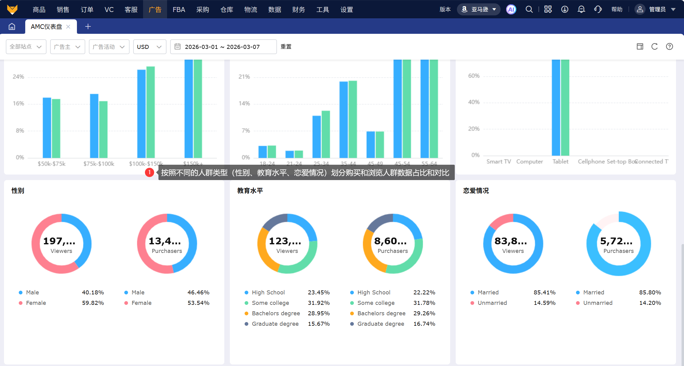 直观展示人群画像,聚合 AMC 核心查询资产,了解各类别人群带来的真实转化效率和投入产出比,便于优化 DSP 广告受众策略。