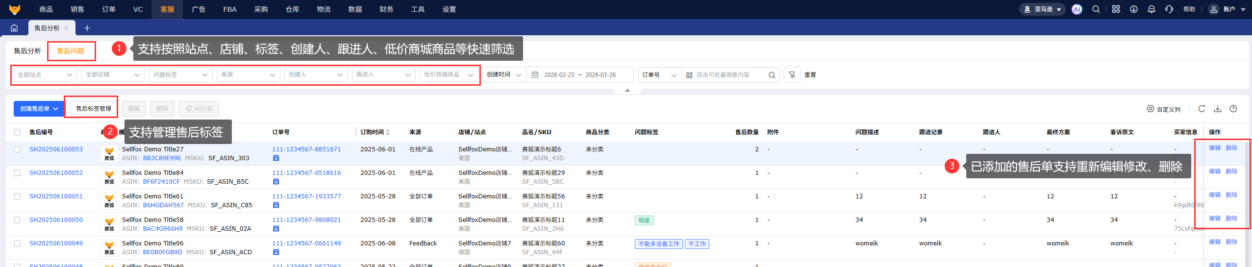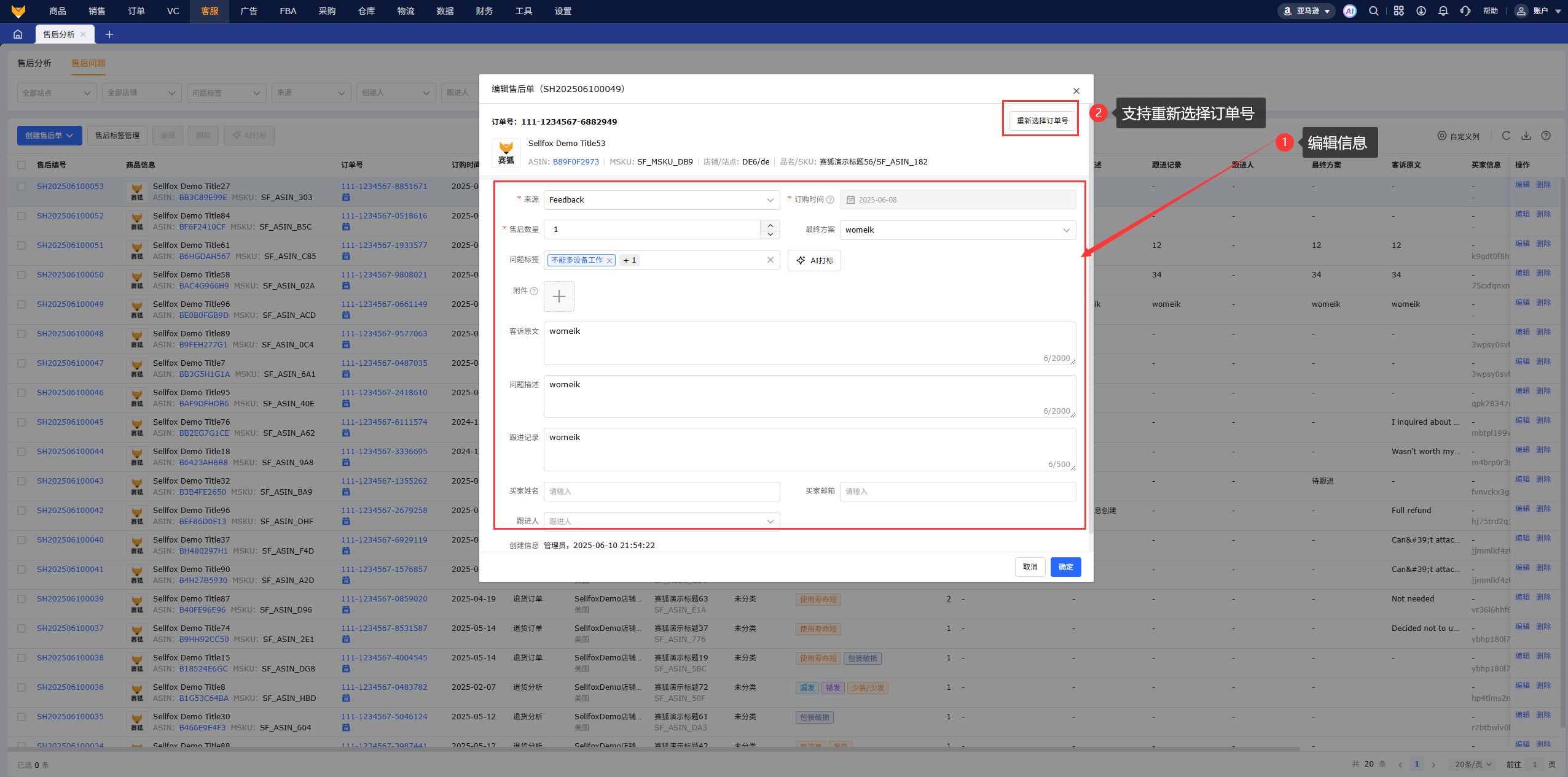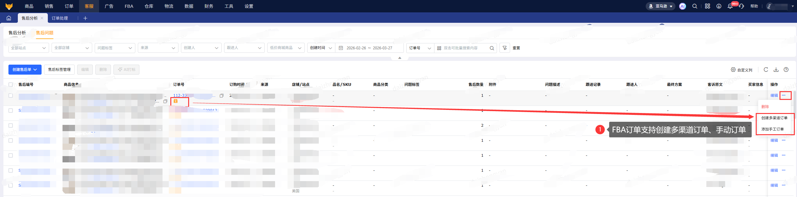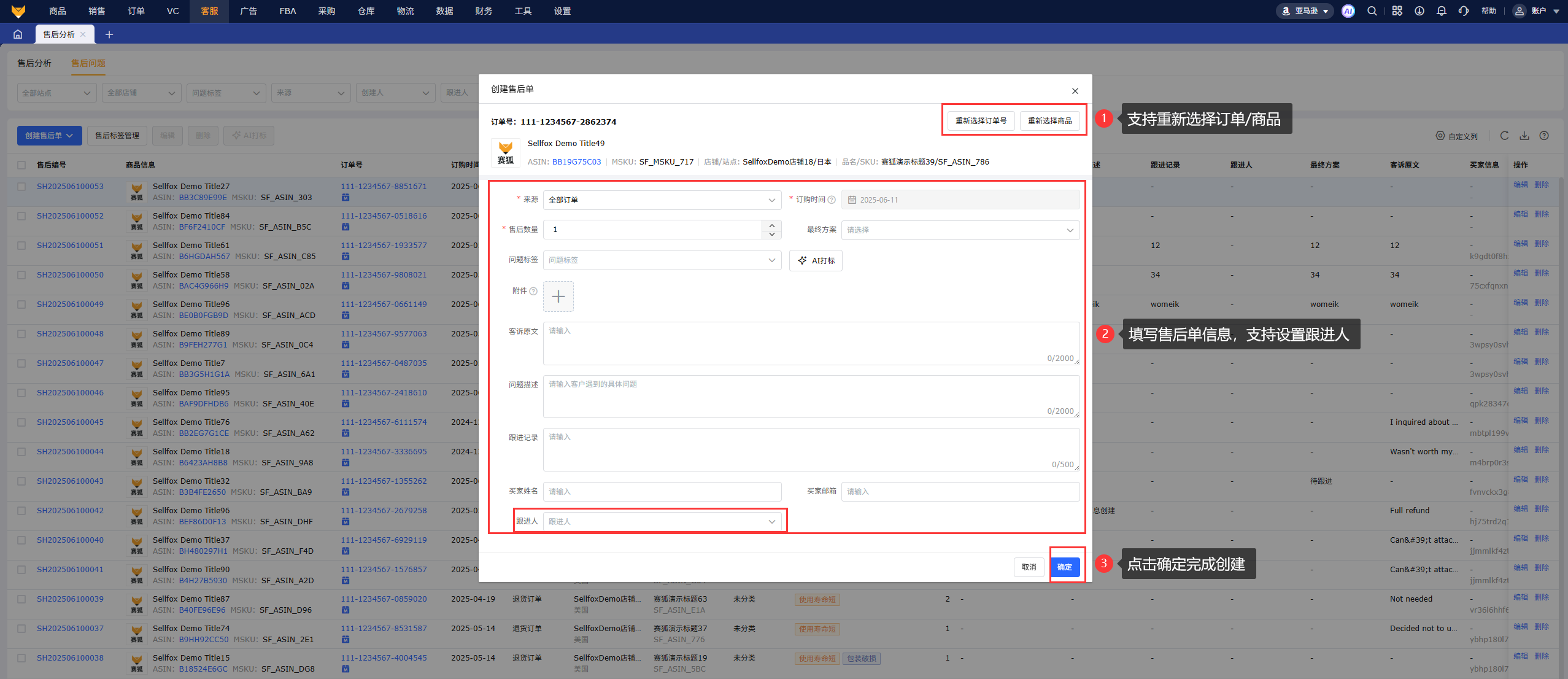(4)创建售后单:退款退货、买家客诉、差评内容,一键添加产品售后单,记录产品问题。