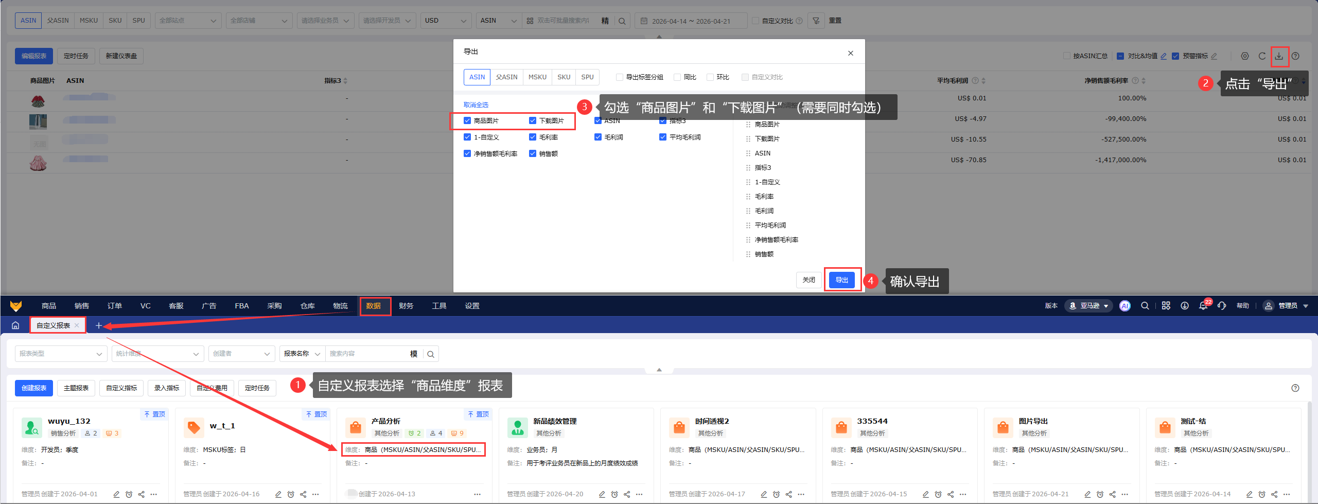 选择商品维度的自定义报表,点击导出按钮选择“商品图片”即原链接和“下载图片”即下载函数(需要下载真实的图片的用户请务必一起选择)。