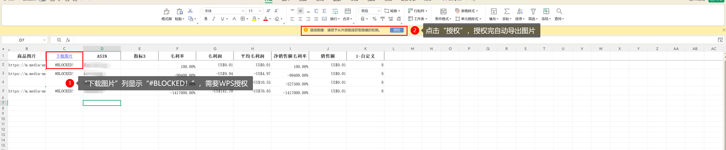 导出文件中导出列为“下载图片”显示“#BLOCKED”,WPS或office会提示:“链接图像:请授予外部链接获取图像权限”,需要先点击“授权”