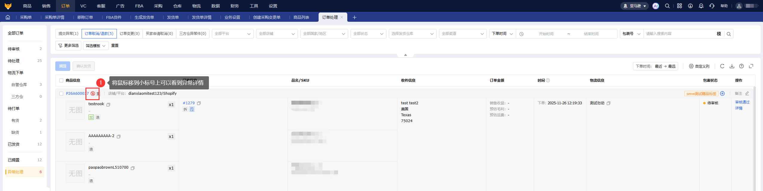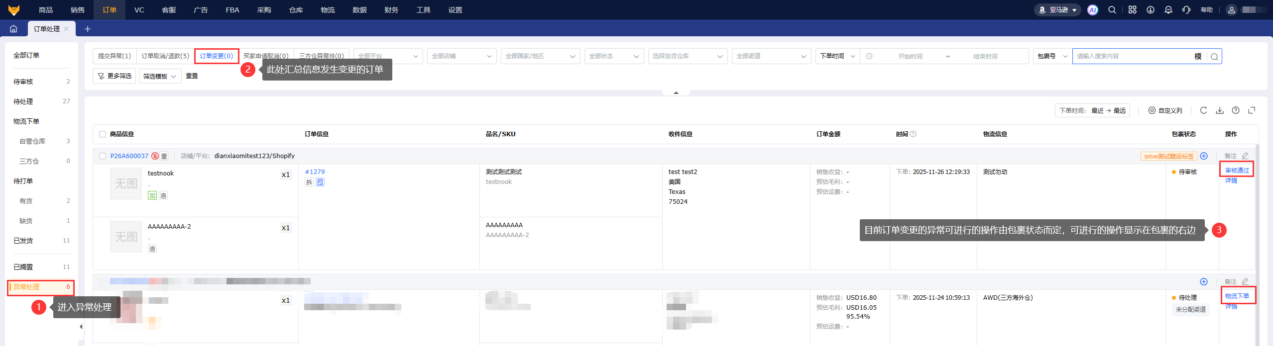 订单信息有变更的包裹会显示在此,卖家需要关注是哪些信息发生了变更,可以通过红色异常小标号看到