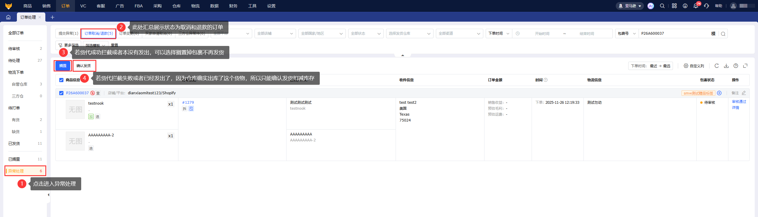 当订单有买家申请取消标识时,订单对应的包裹会显示在买家申请取消里;