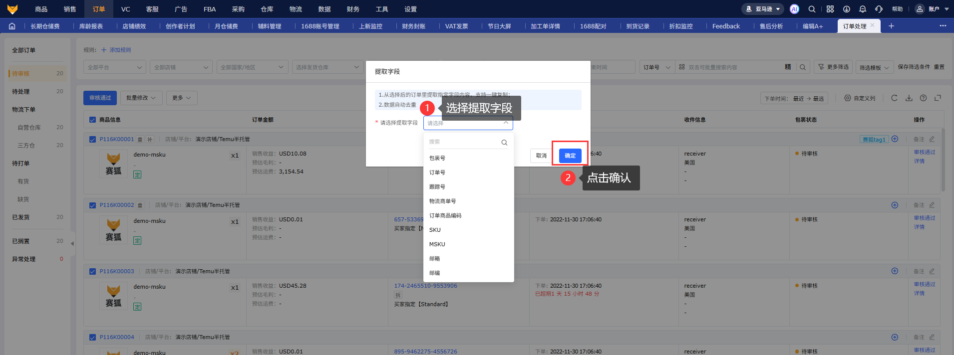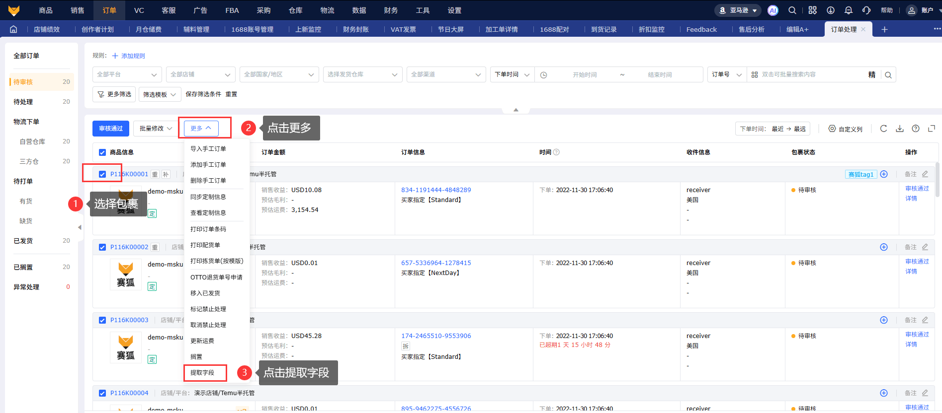 点击【更多】-【提取字段】,可按包裹号、订单号、跟踪号、物流商单号、订单商品编码、SKU、MSKU、邮箱、邮编提取字段,一次只能提取一个字段,在待审核、待处理-所有包裹/已合并、物流下单-自营仓库成功/失败/待更新、物流下单-三方仓成功/失败/待更新/异常件、待打单-有货/缺货、已发货、已搁置状态的更多操作栏均可操作;