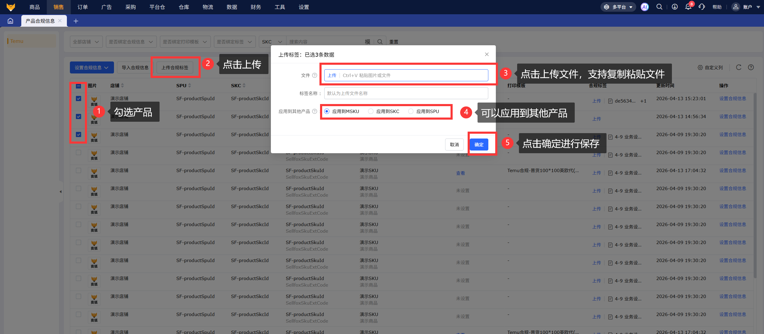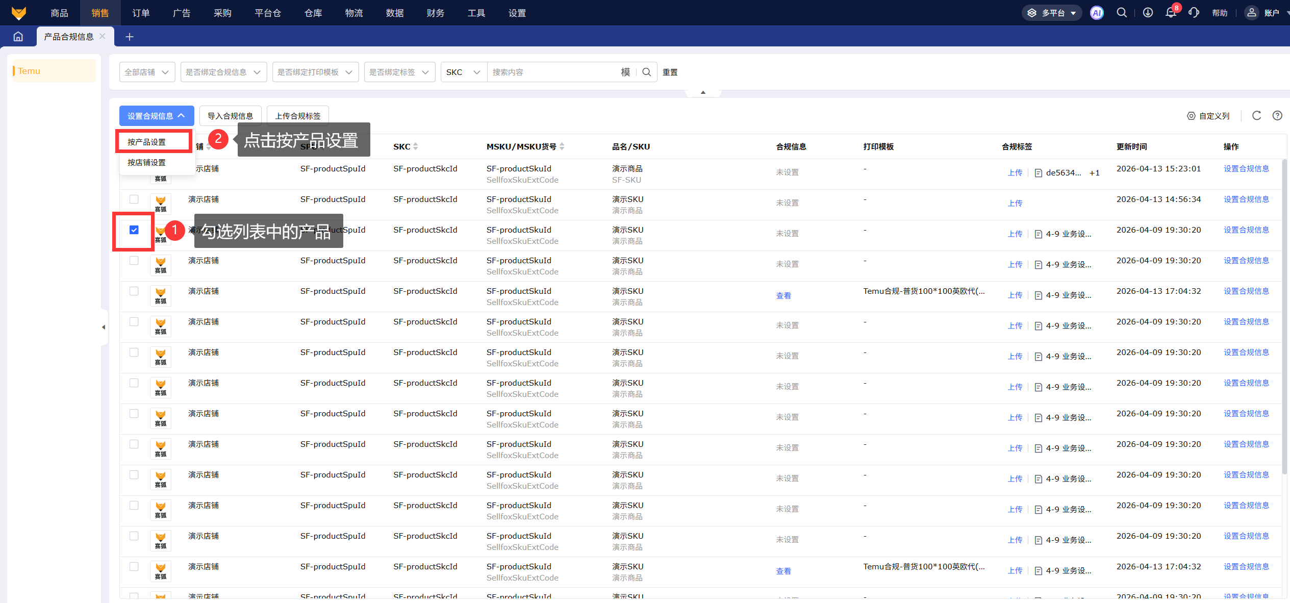 按产品设置:合规信息按照产品维度设置,同时也可以扩大保存范围,支持选择应用到SKC和应用到SPU。