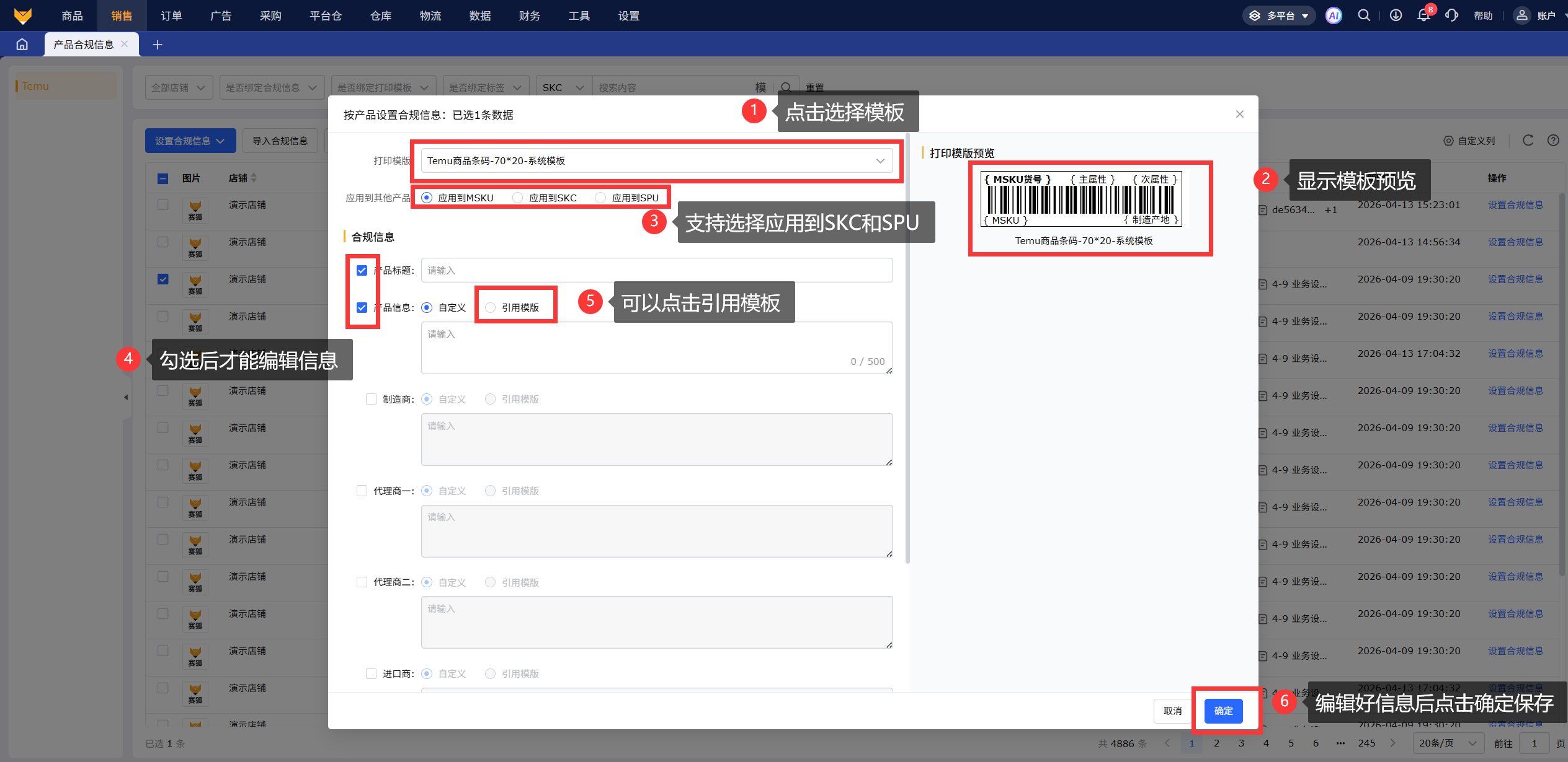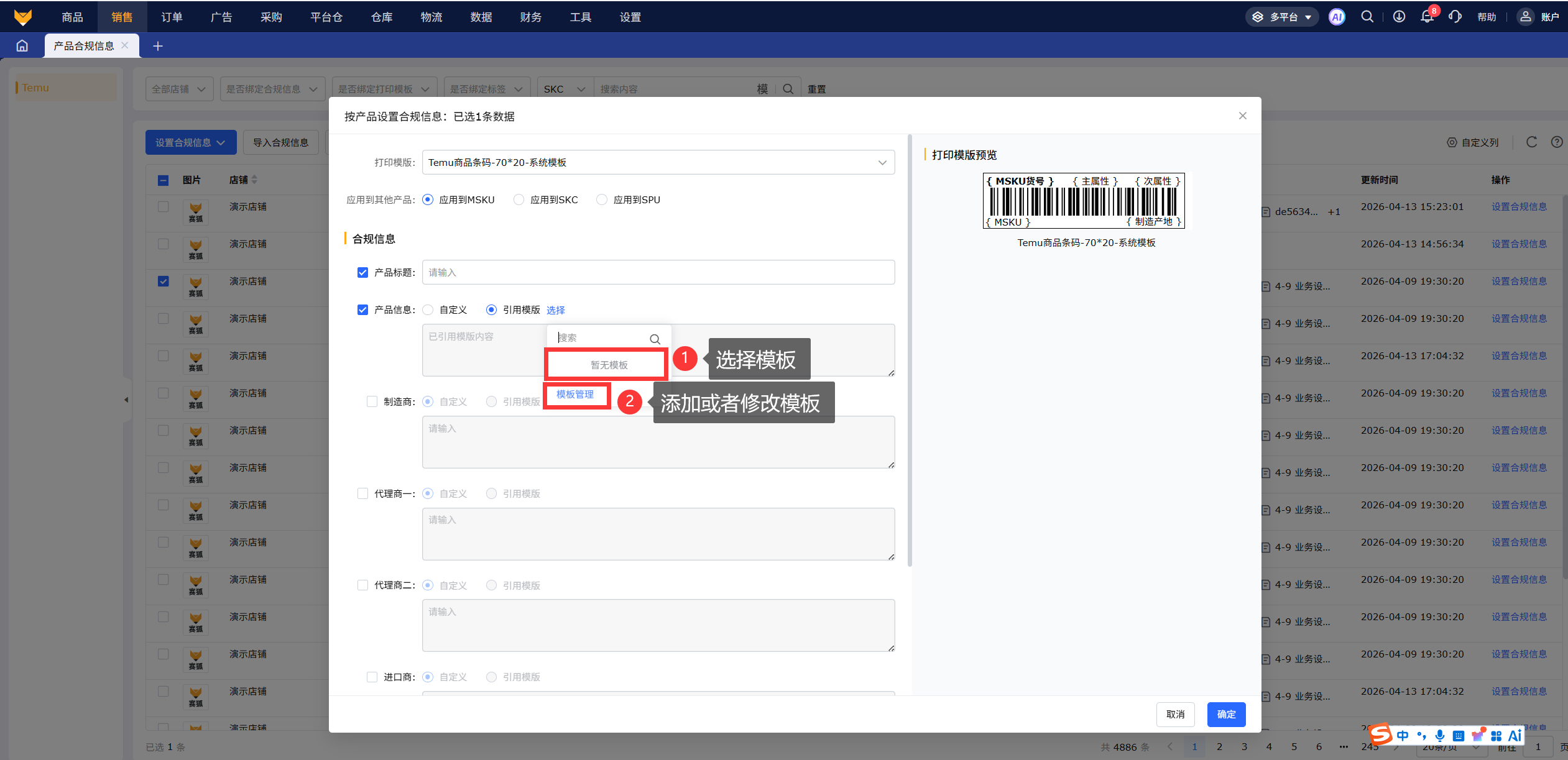 勾选列表中的产品,点击按产品设置,选择打印模板后右侧会显示模板预览,所有合规信息都不是必填项,勾选才可以填写或选择信息模板,否则处于不可编辑状态,每个输入项最大可输入500个字符,点击保存信息的时候,只会对勾选项的信息进行更新。