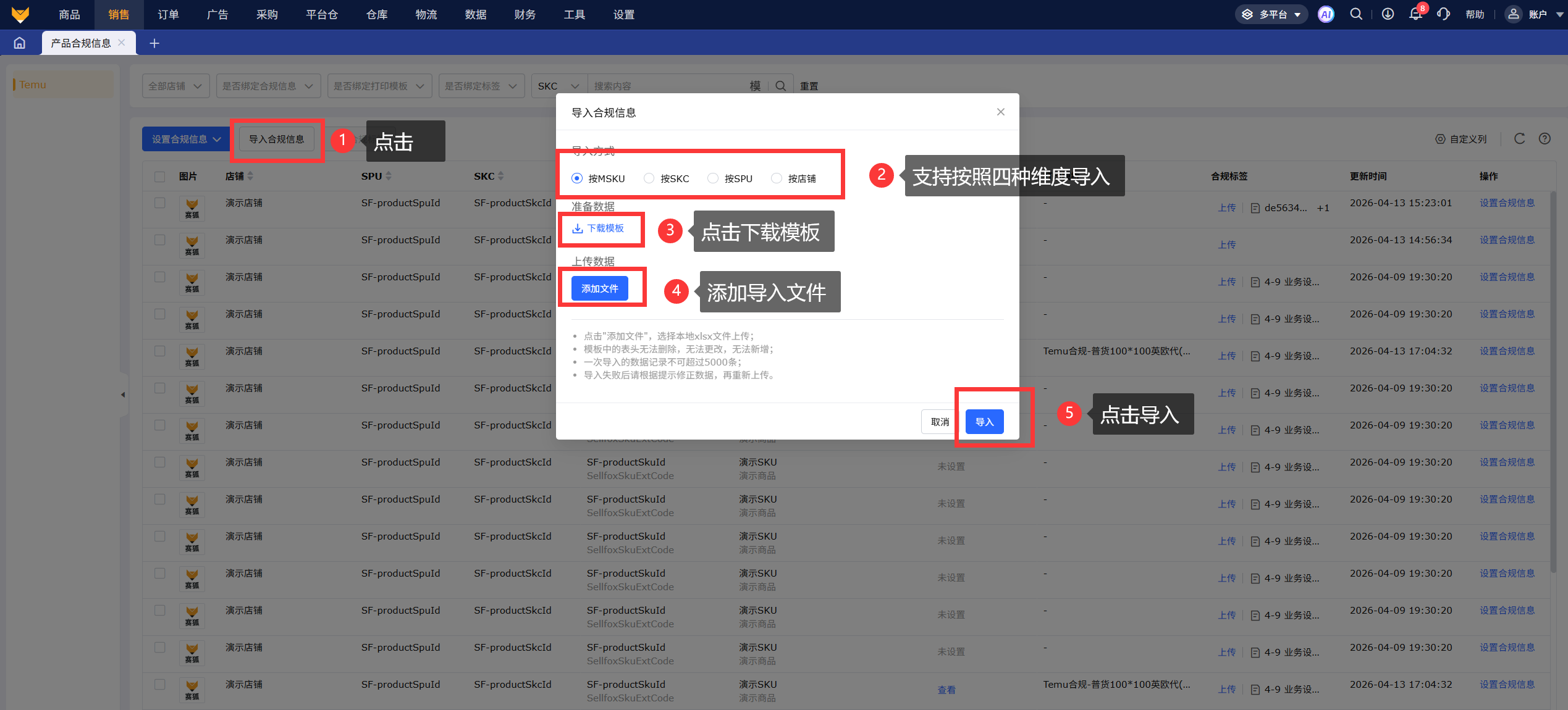 导入合规信息支持按照四种维度导入,分别为按店铺、按SKC、按SPU和按MSKU导入,导入的模板一次最多支持5000条记录,导入表格字段为空时,表示不更新该字段。