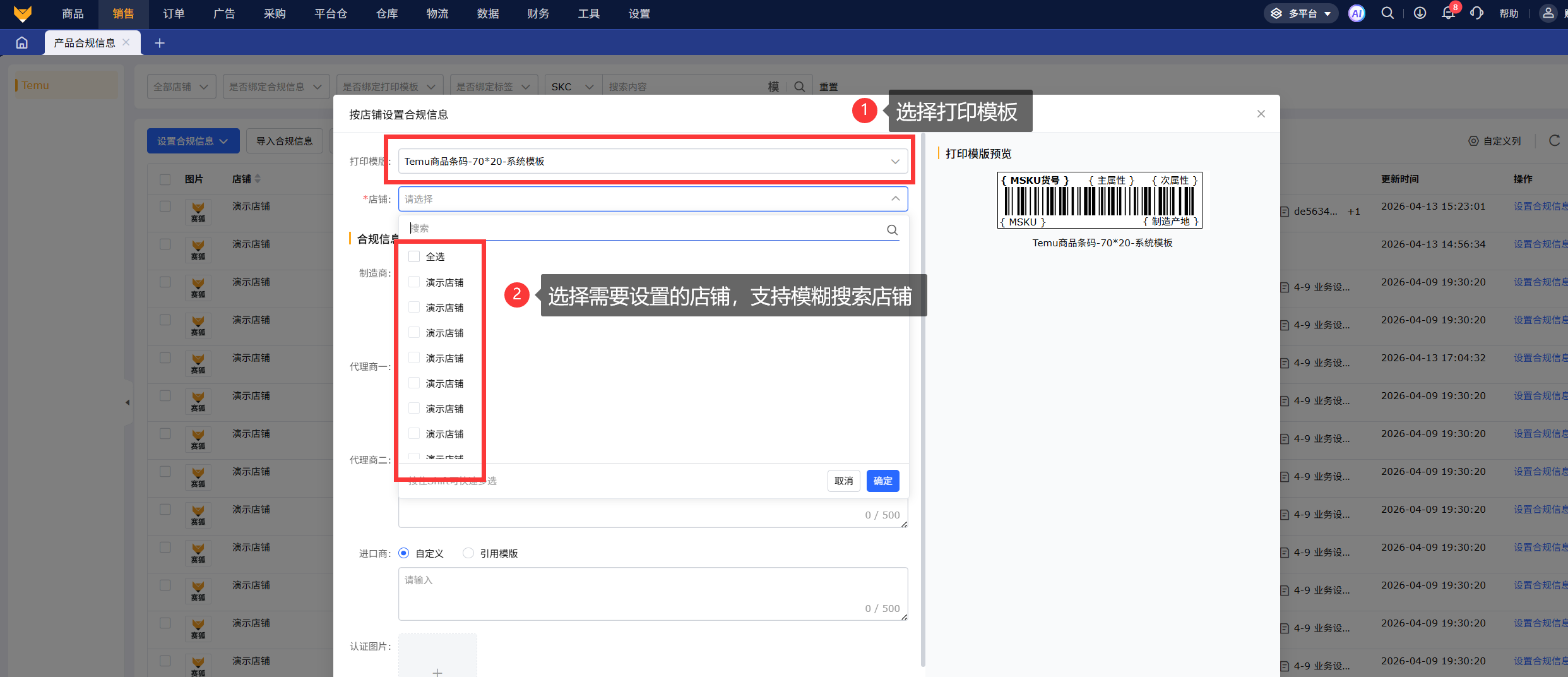 按店铺设置:按店铺维度设置合规标签,不需要选择产品,直接根据选择的店铺统一设置合规信息、打印模板,设置后,整个店铺下所有产品合规信息、打印模板均被修改。