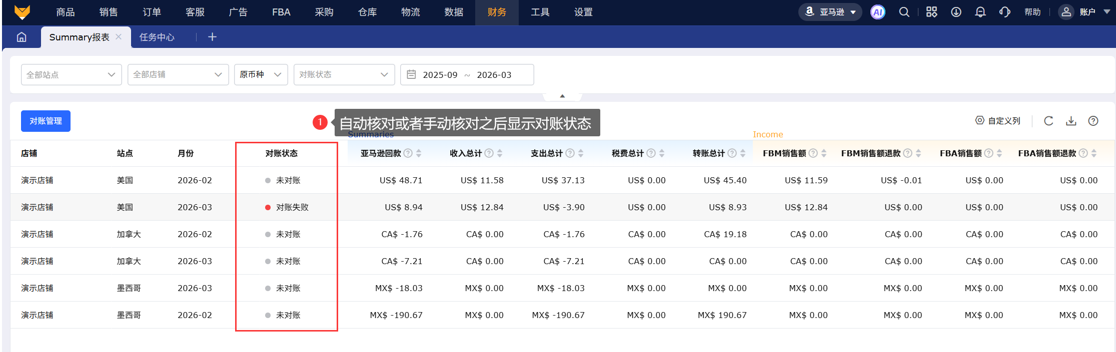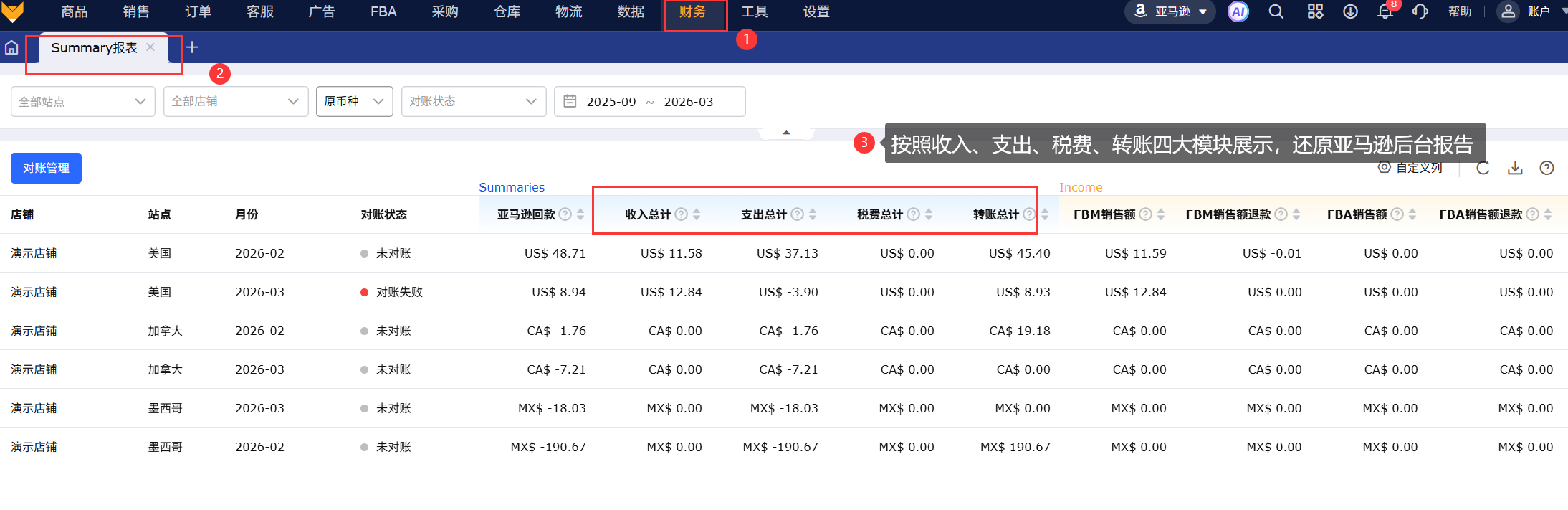 按照收入、支出、税费、转账四大板块展示,1:1还原亚马逊后台Summary报告