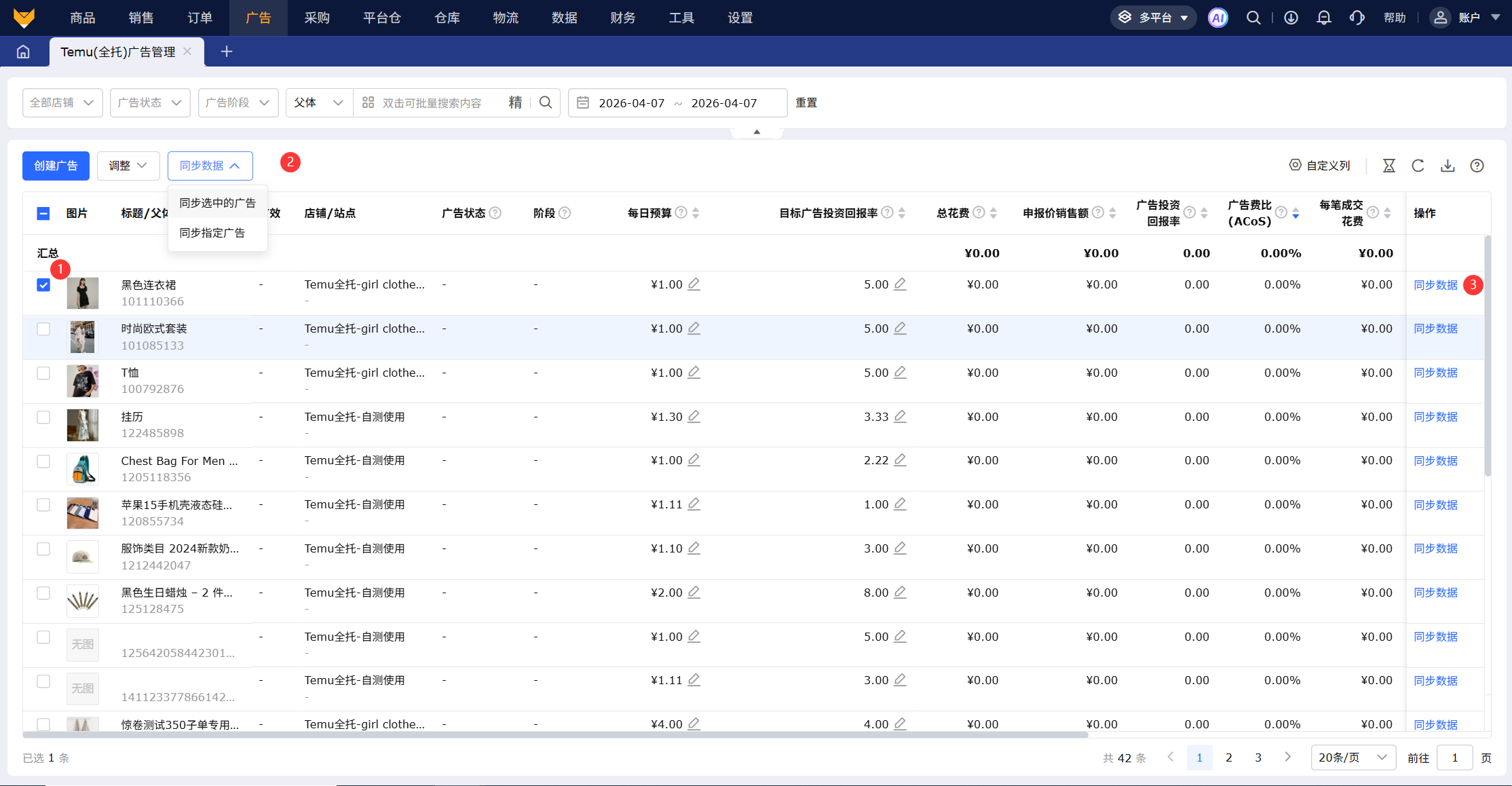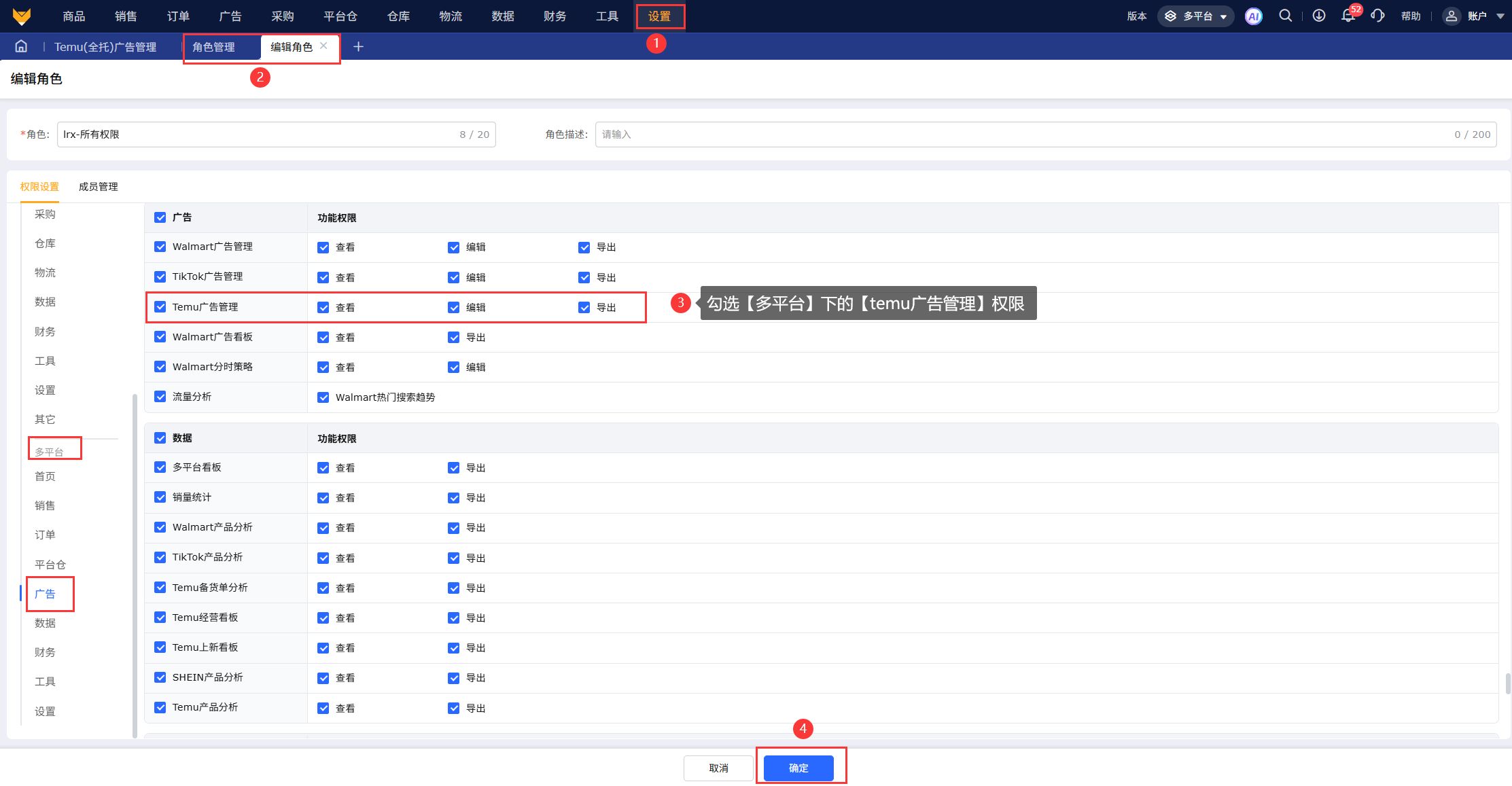 在【设置】-【角色管理】页面,针对角色选择多平台下的Temu广告管理权限,才能查看到对应页面数据。2、筛选与查看