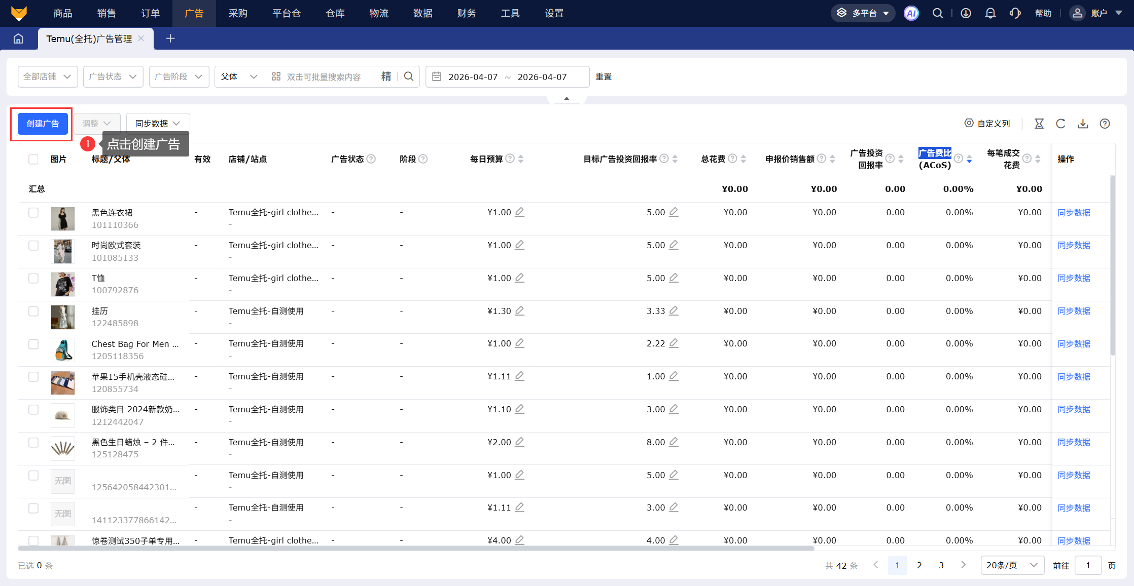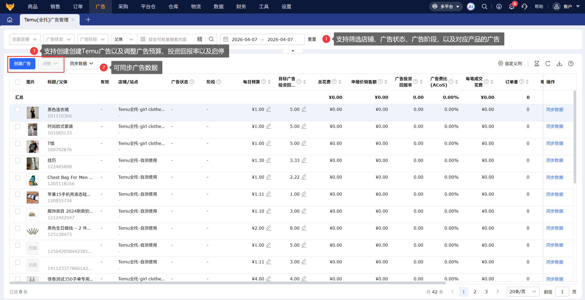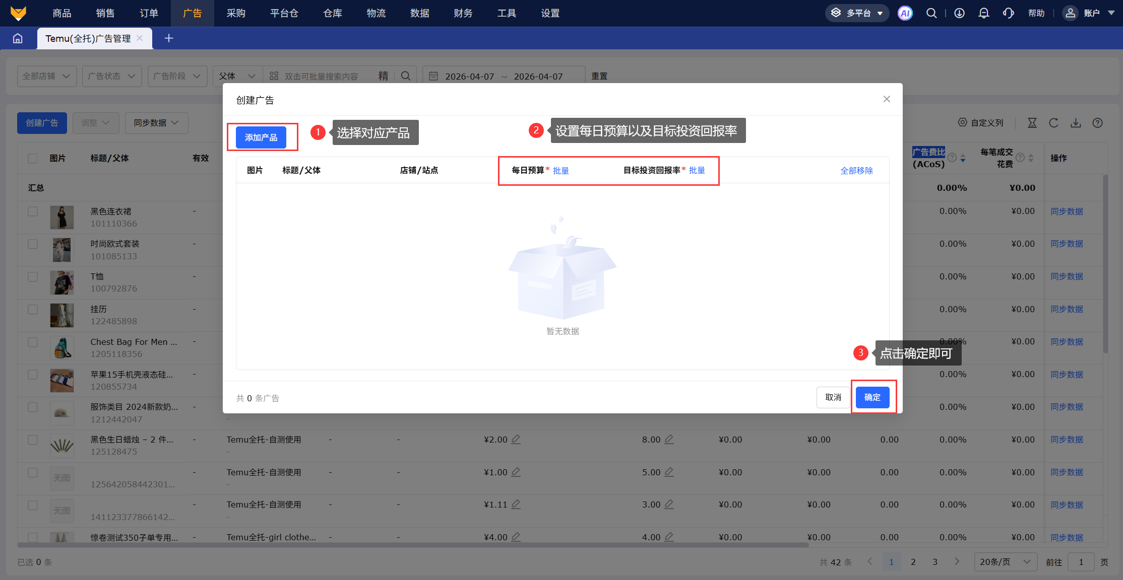 帮助卖家在ERP内完成Temu全托广告的创建、管理和效果分析,实现广告从"店铺分散操作“到“统一可控投放”。