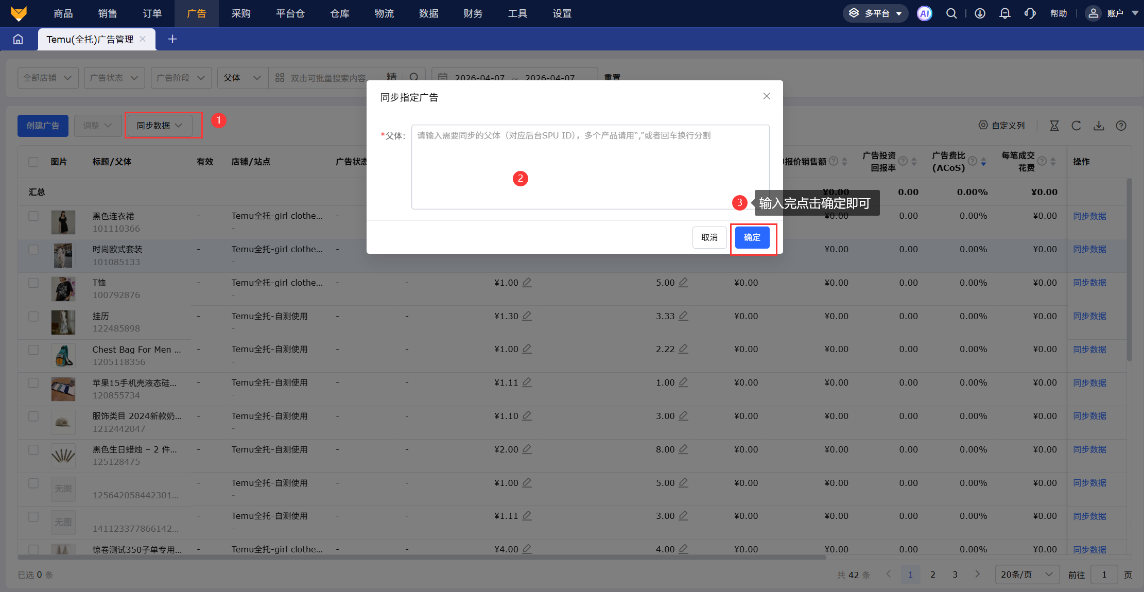因Temu全托广告无法直接同步到赛狐,需要通过输入父体信息进行同步;