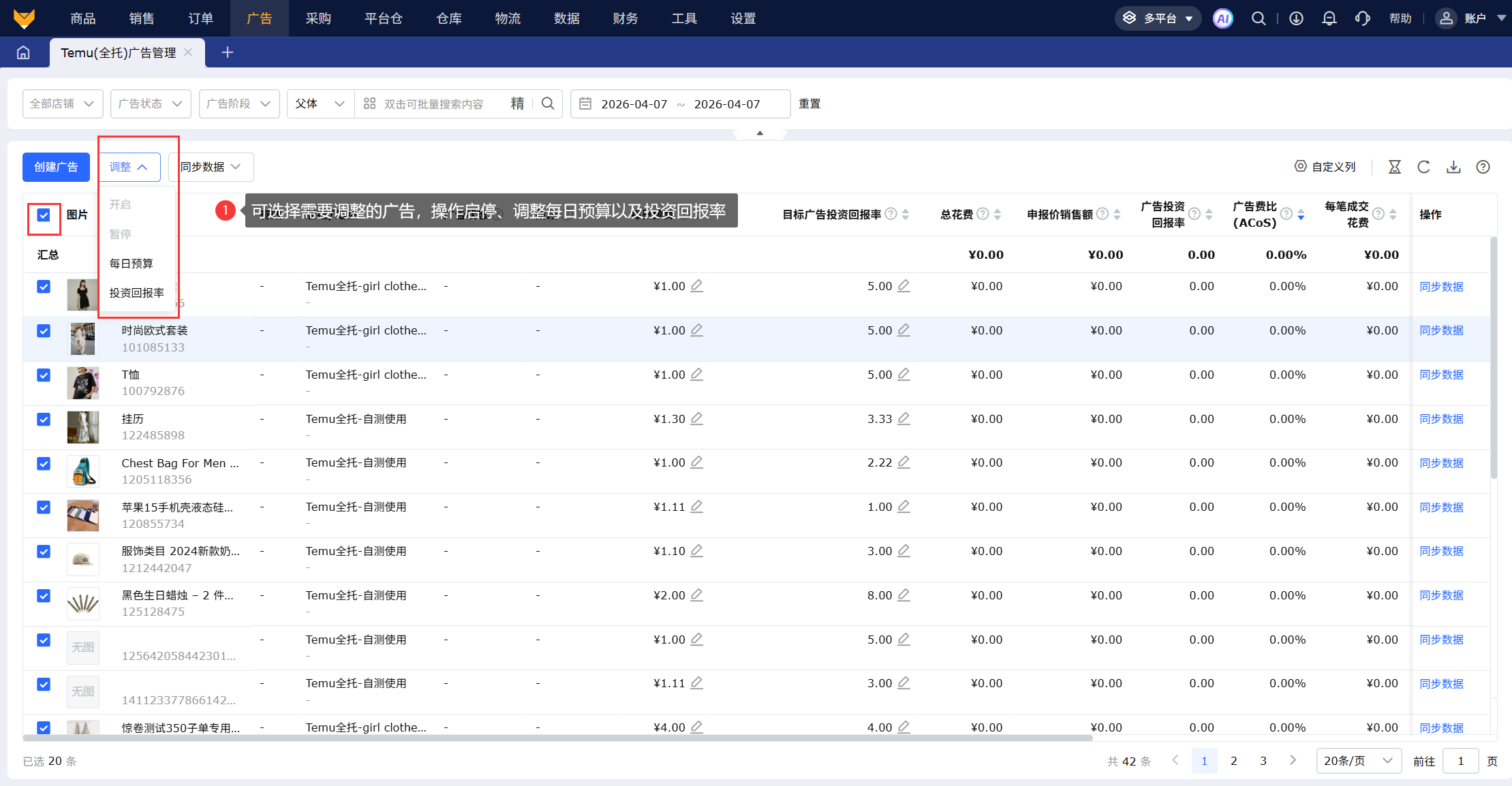 可选择需要调整的广告,操作启停、调整每日预算以及投资回报率;