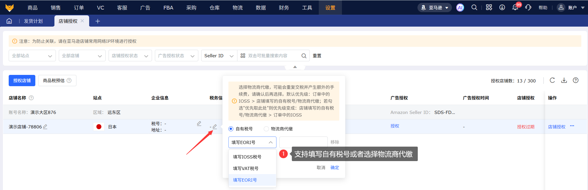 (6)欧盟税号,将税号填入对应授权店铺里,如IOSS税号,IOSS税号可以找亚马逊获取;