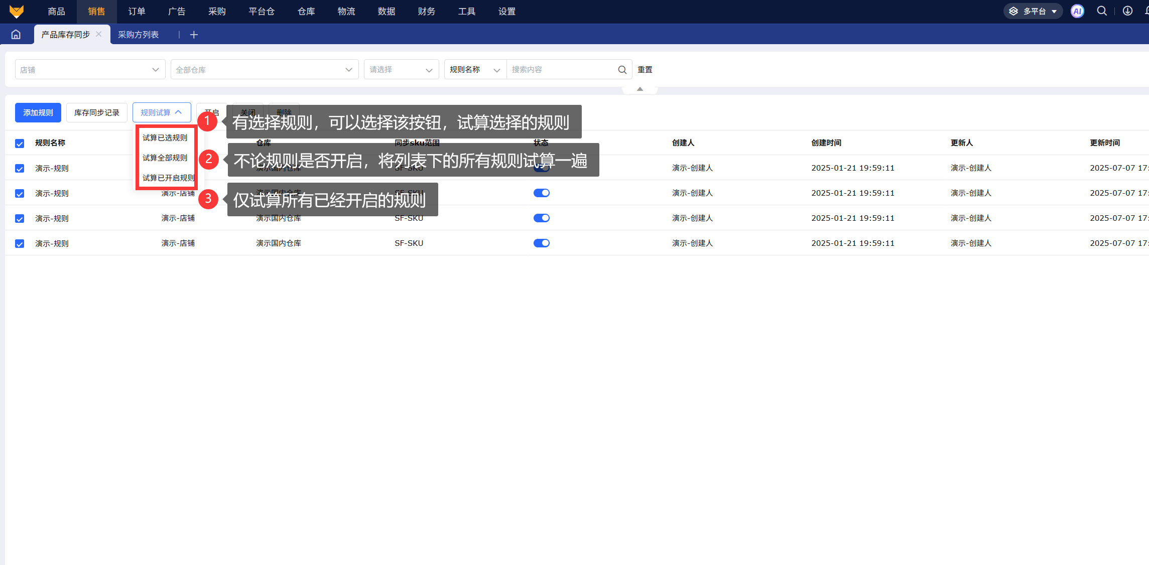 可以通过在系统点击规则试算得出,系统推送到平台的库存数。分为三种:
