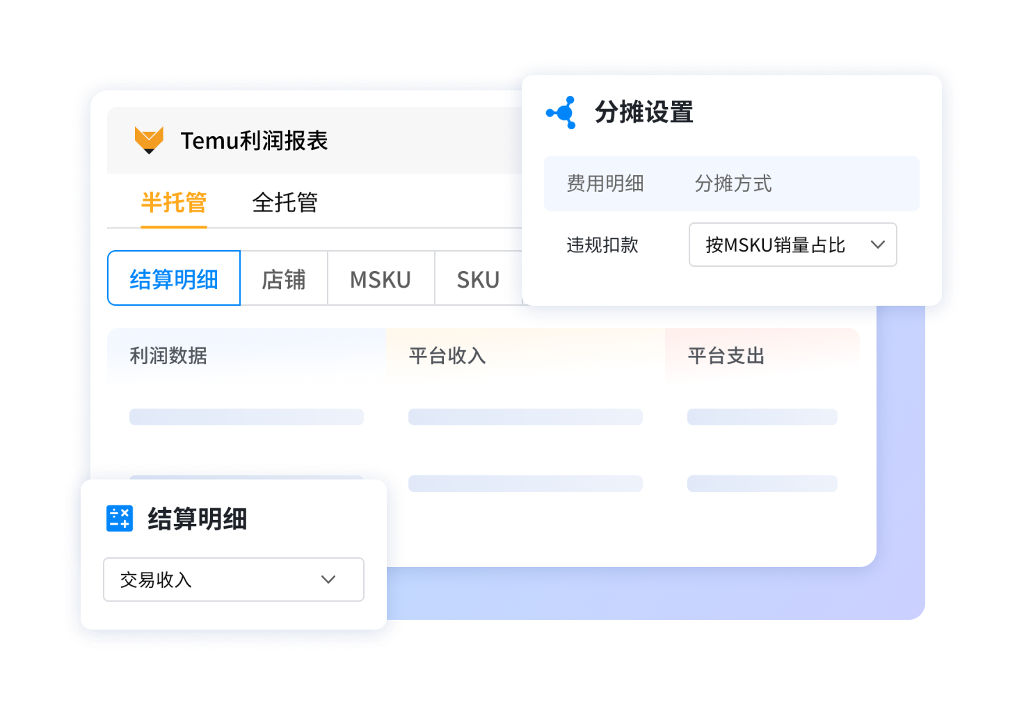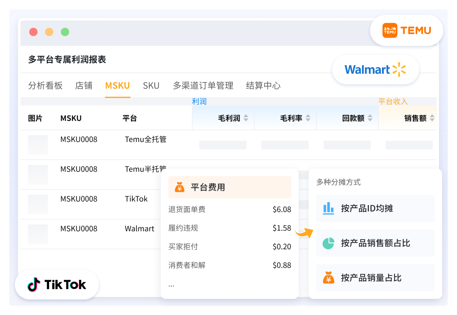 Temu、TikTok、Walmart平台专属利润报表,解决平台模式不同、收支数据来源各异、平台费用分摊复杂、算不清账的问题