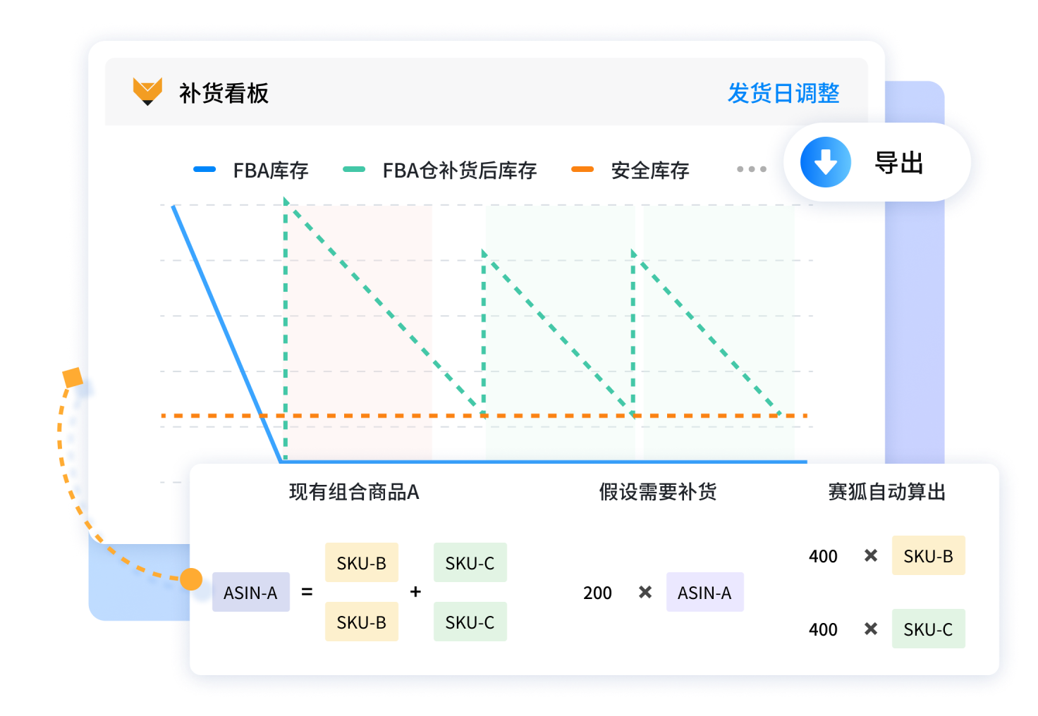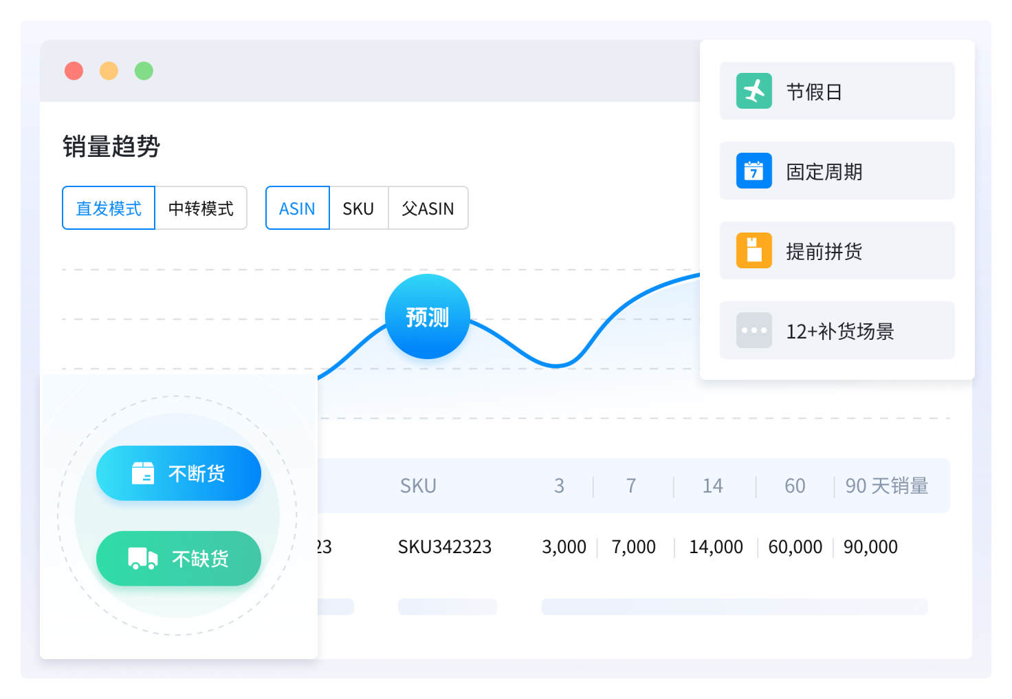 借助大数据精准预测未来销量走势,运用 5 大专利算法,兼顾节假日、 固定周期、提前拼货等 12+种补货场景,助您不断货、不压货