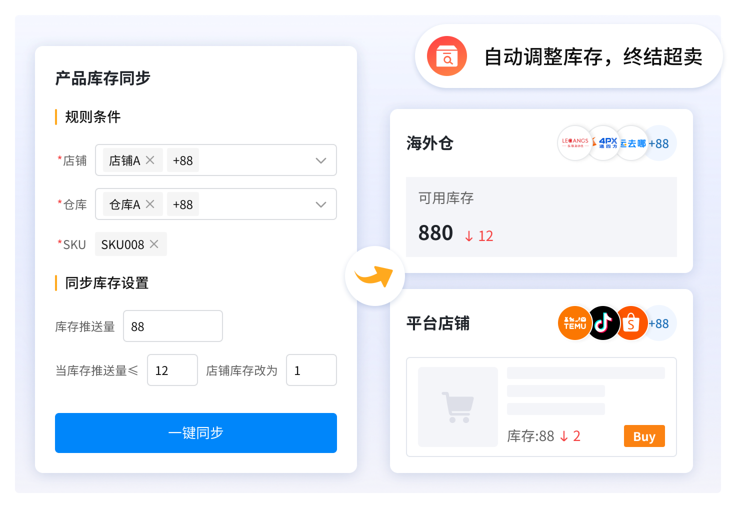 自动同步本地仓、海外仓、FBA仓库存到线上listing彻底终结缺货超卖,存货少卖难题
