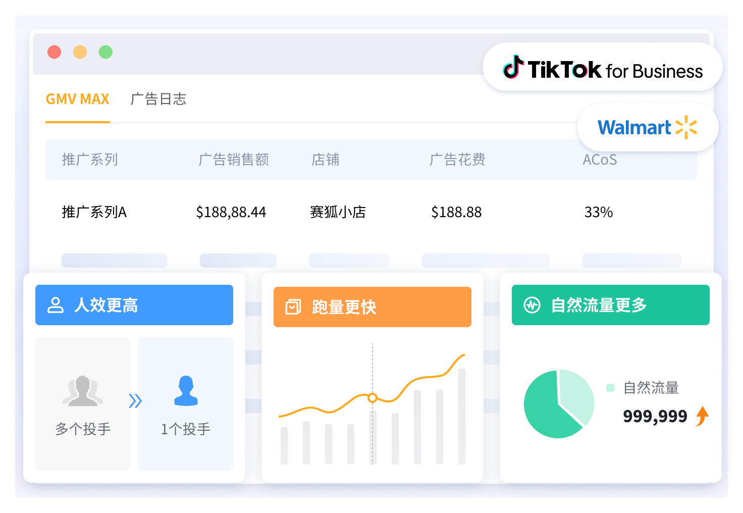 集成TikTok GMV Max和Walmart广告功能,跨店铺管理更高效